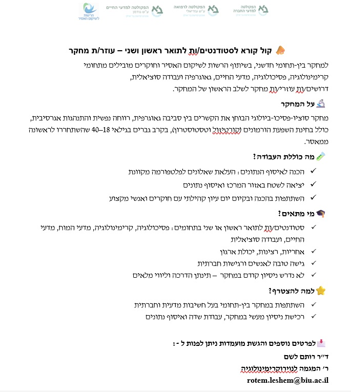 דרושים/ות עוזרי/ות מחקר לשלב הראשון של המחקר.